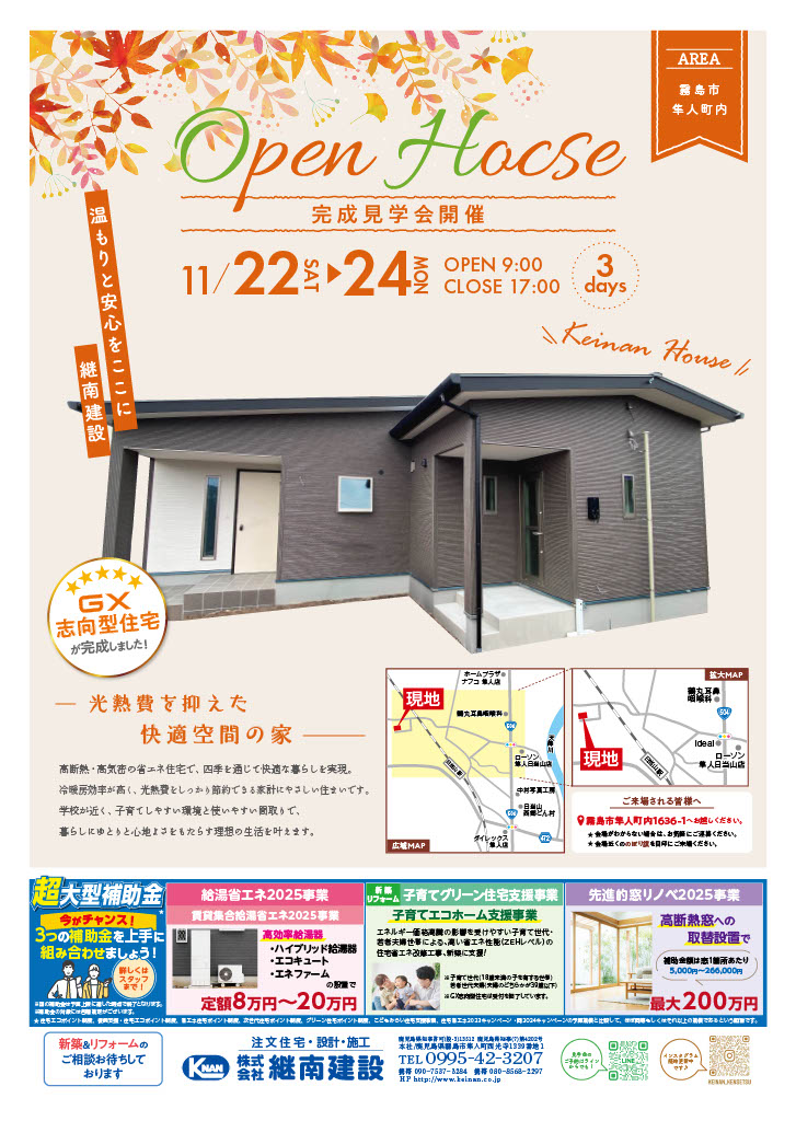 ☆☆☆11月22日(土)~11月24日(月)☆☆☆ 3日間限定! 完成見学会 GX志向型住宅 この度、お施主様のご厚意により3日間限定の完成見学会を実施致します^^;) 注文住宅・リフォーム検討中の方はもちろん!新築ご検討の方のご相談お待ちしております。 ☆注文住宅やリフォームを検討中の方も大歓迎☆ 当社の代表を中心に業界歴10年以上のベテランからセンスあるスタッフが対応させて頂きます。昨今ではフルリノベ(スケルトンリノベ)も弊社でも増えてきております! ご予約、飛び込み訪問大歓迎ですので、是非ご来場ください。 《こんな方におすすめです♪》 ●リフォーム、リノベ検討中の方 ●新築を検討中の方 ●建売を検討中の方 ●自分の理想を実現したい方 ●キッチン周りの動線にこだわりたい方 ●限られたスペースを有効活用したい方 ●リビングの間取にこだわりたい方 ●2階建てを検討されている方 ●補助金制度を詳しく知りたい方 ●サンルームやウォークインクローゼットなど設備を充実させたい方 お家づくりのアイデアがきっと見つかります♪ 皆様のご来場を心よりお待ちしております。 ーーーーーーーーーーーーーーーーーーーーーーー ぜひお気軽にお問い合わせ下さい。 日時:11月22日(土)~11月24日(月) 9時~17時 場所 :〒899-5116 鹿児島県霧島市隼人町内 Googleマップ https://maps.app.goo.gl/jN6igqKW3VQYRh7D8 連絡先:0995-42-3207(当日は携帯に転送されます) 携帯 :090-7537-3284(中釜) 080-8568-2297(村田) 080-8397-7028(中村) ーーーーーーーーーーーーーーーーーーーーーーーー ↓公式ラインやインスタグラムのDMからもご予約承ります↓ インスタグラム https://www.instagram.com/p/Cc6fajvPKFR/?igshid=YmMyMTA2M2Y= 公式ライン https://lin.ee/USma9v3
