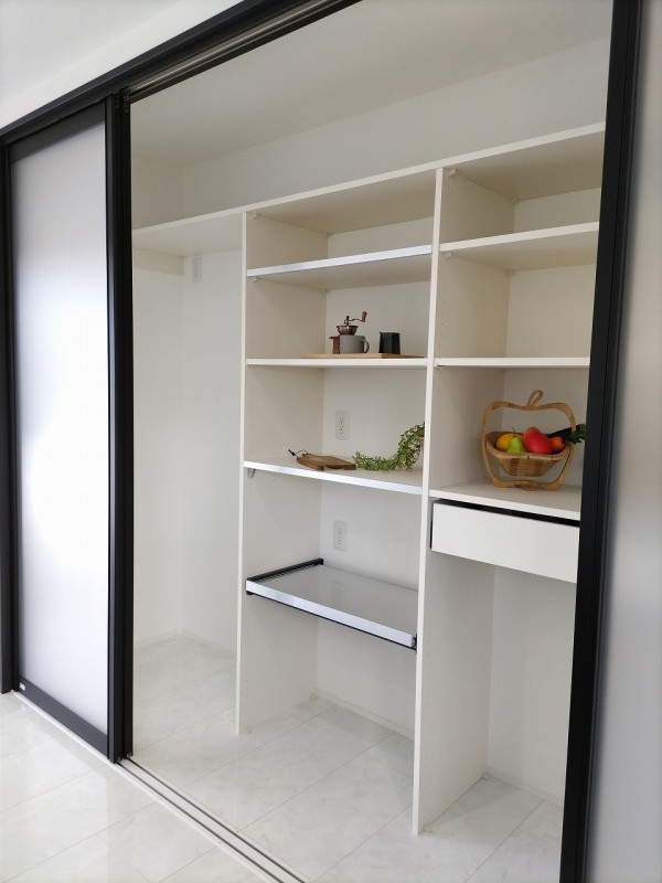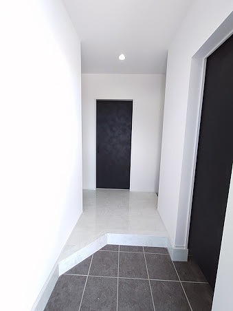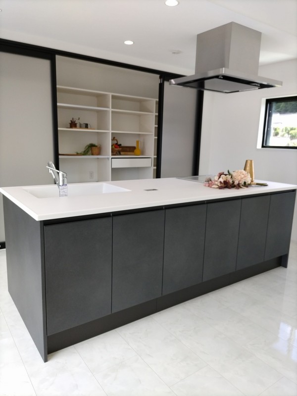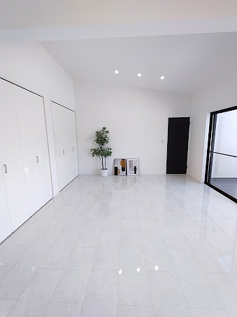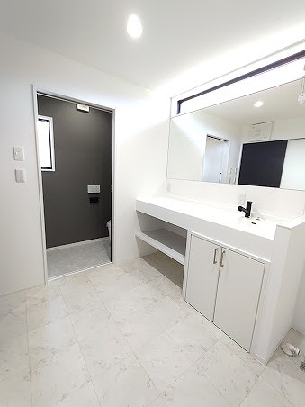 ホワイトを基調にモノトーンでまとめた高級感あふれるお家です。 フロアタイルは艶のある大理石柄を使用。 収納扉には鏡面仕上げの建具を使用することで、洗練されたホテルライクな空間が広がっています。 大容量のキッチン収納やリビング収納は、生活感を隠しつつ、生活動線も楽にしてくれるでしょう。 ホワイトで統一された造作洗面は、清潔感溢れ、ご家族で並んで使っても余裕の広さです。 お家全体が美しく統一され、ご家族みなさんが気持ちよく過ごせる空間となっています。