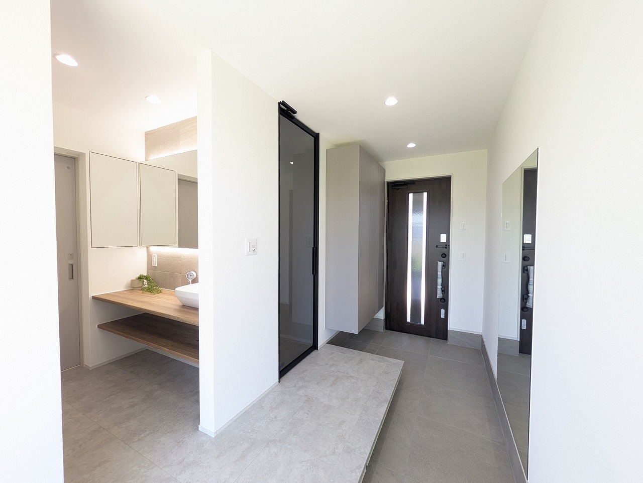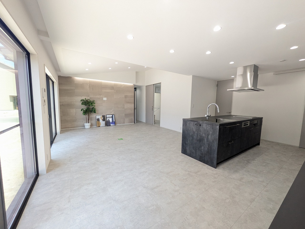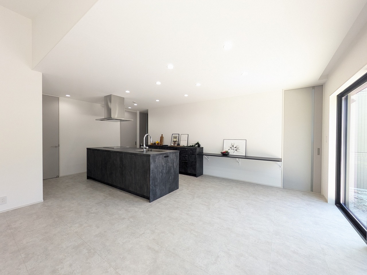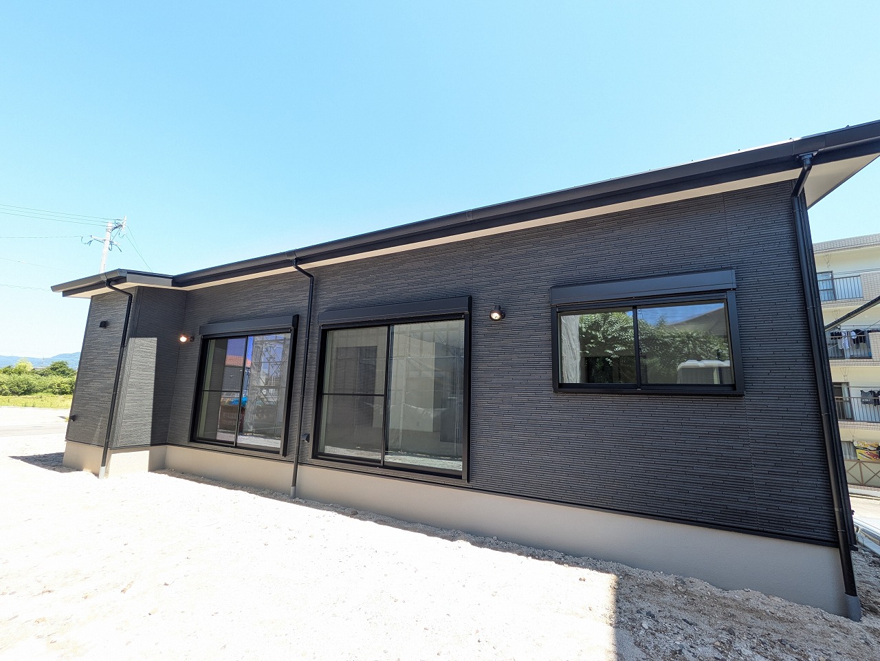 黒を基調とした外壁が放つ、凛とした存在感。白・黒・グレーでまとめた室内は、落ち着きと高級感を兼ね備えた上質な空間。広々とした玄関ホールと洗面所、開放感あふれるアイランドキッチンがワンランク上の暮らしへと導くスタイリッシュな平屋です。